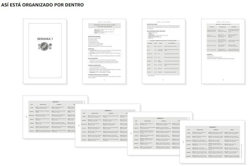 Es un plan guiado de 4 semanas, con 84 recetas organizadas en desayuno, comida y cena, pensado para que estén cubiertas todas las necesidades nutricionales, que no te falte ni proteína, ni grasa saludable, ni carbohidratos, ni vitaminas, ni minerales, y para que puedas abrir el libro y saber qué cocinar cada día sin tener que improvisar.